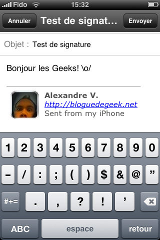 Comme j’ai tout récemment acquis un iPhone 2G, je vais vous écrire de petits tutoriaux sur comment bidouiller votre iPhone… Je commence par un petit tuto très simple pour changer la signature « Sent from my iPhone » par quelque chose de plus professionnel et par le fait même plus Geek. 😉