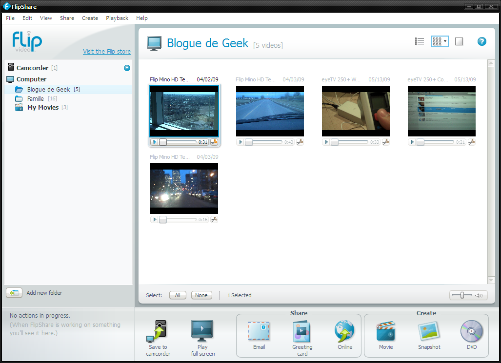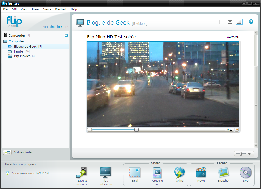 Déjà que le logiciel soit inclus à l’intérieur de la caméra, c’est déjà un point pour le Mino HD, mais la simplicité du logiciel est presque ridicule! Même ma grand-mère pourrait s’y retrouver! Vous avez deux sections, soit Partager et Créer. Vous pouvez partager le vidéo par courriel, faire une carte de souhait électronique ou bien le téléverser vers un site de partage de vidéo (AOL, Youtube et MySpace seulement).