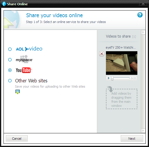 - Téléversement simplifié vers Youtube et MySpace
