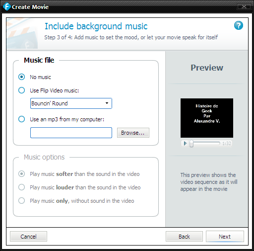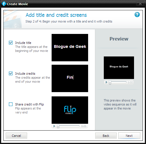 Dans la section Créer, vous pouvez créer un DVD, capturer une image d’un vidéo ou créer un film. Les vidéos de la section précédente n’ont pas été modifié pour garder le plus de qualité possible, mais il existe une fonction film où vous pouvez ajouter un titre de début et de fin et même une musique d’ambiance qui s’ajoute ou remplace le son du vidéo. Le vidéo créer sous Windows sera un WMV et sous Mac, un MOV.